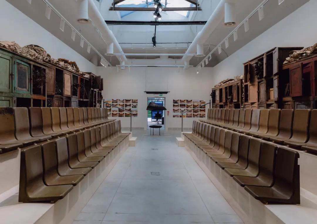 《遷移》,奧斯納布呂克美術館,德國奧斯納布呂克,2023年 © APALAZZOGALLERY TRANSFER(S), Kunsthalle Osnabrueck, Osnabrueck, Germany, 2023 © APALAZZOGALLERY 馬哈馬將其創作過程形容為一種“時間旅行”——通過材料的收集與重構,生成全新的敘事結構,與社會歷史展開對話。他的作品常涉及殖民與后殖民烏托邦的殘余,聚焦材料、社會與空間之間關系的崩解。他標志性的材料包括黃麻袋、木材與工業廢料,這些元素承載著“歷史的重量”,同時也體現了個體與集體在現實中所承受的肉身之重。在2023年的作品《幽靈議會》(Parliament of Ghosts)中,馬哈馬通過廢棄火車座椅、舊軌道鐵件、殘損窗框等元素,重構加納獨立以來政治空間與集體意識的殘片。裝置如同一個沉默的劇場,將觀者置于殖民制度解體后的回聲中,回望未竟的現代化烏托邦與歷史沉積的矛盾結構。