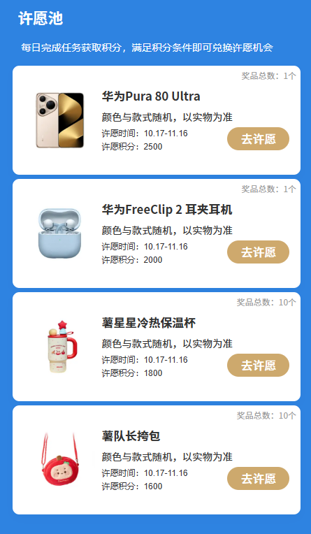 • 打卡做任務,許愿贏好禮:完成每日任務賺積分,攢夠積分即可參與“許愿池”抽獎,就有概率贏華為旗艦手機、耳機、小紅書定制周邊等驚喜好禮!