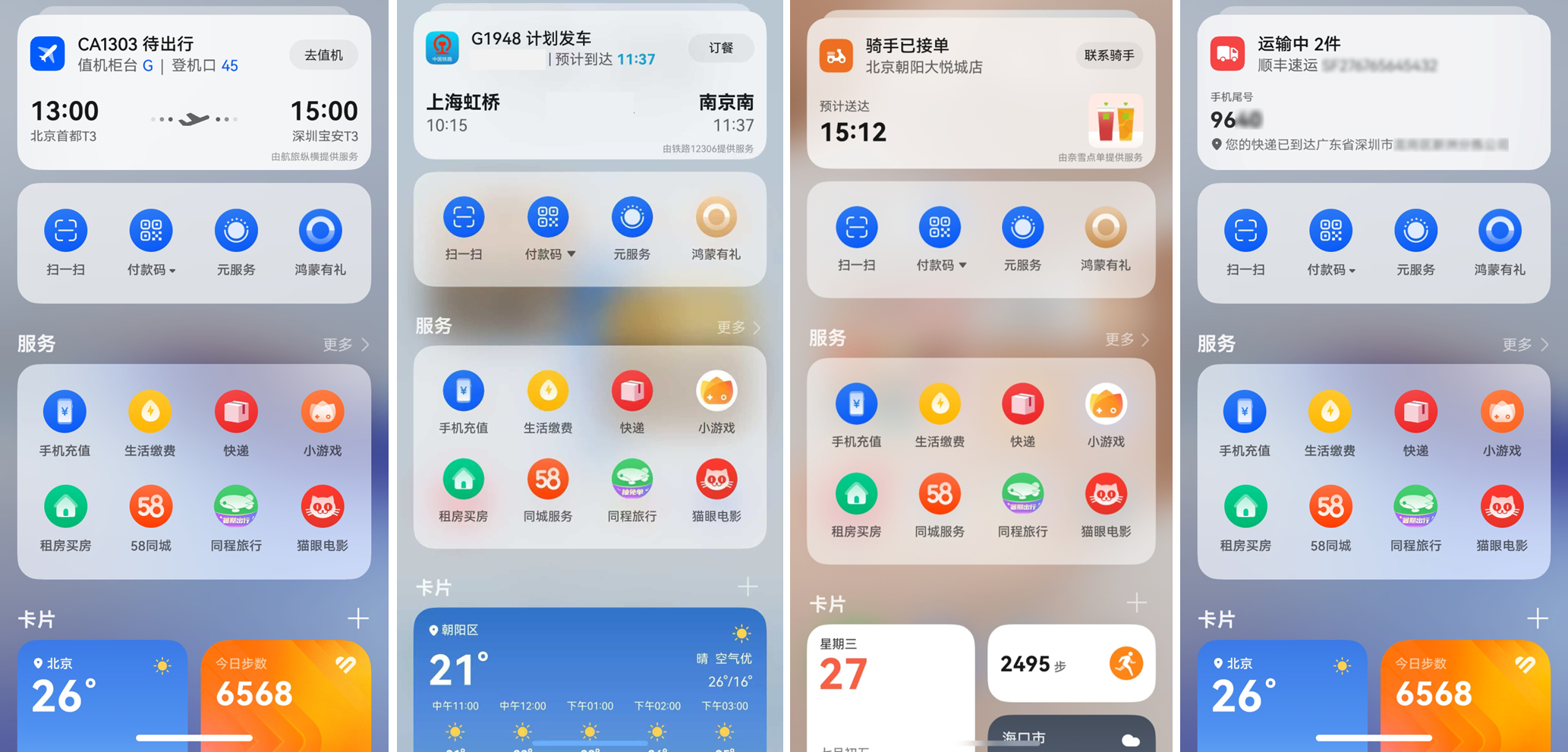不止好玩更好用,負一屏讓生活更省心 除了能參與活動贏大獎以外,在手機桌面右滑進入負一屏,還能享受超多便捷服務,包你用得順手、用得省心: 動態卡片:關鍵信息主動呈現,實時動態盡在掌握 告別頻繁打開App!只需在負一屏“動態管理”中開啟12306、航旅縱橫等服務動態,航班車次、檢票口等信息即可實時跟蹤,桌面右滑一下優雅出發。此外,動態服務卡片還能添加諸如外賣、快遞等各類生活服務,雙十一已經開始,開啟快遞卡片助你輕松掌握快遞動態,省錢更省心。