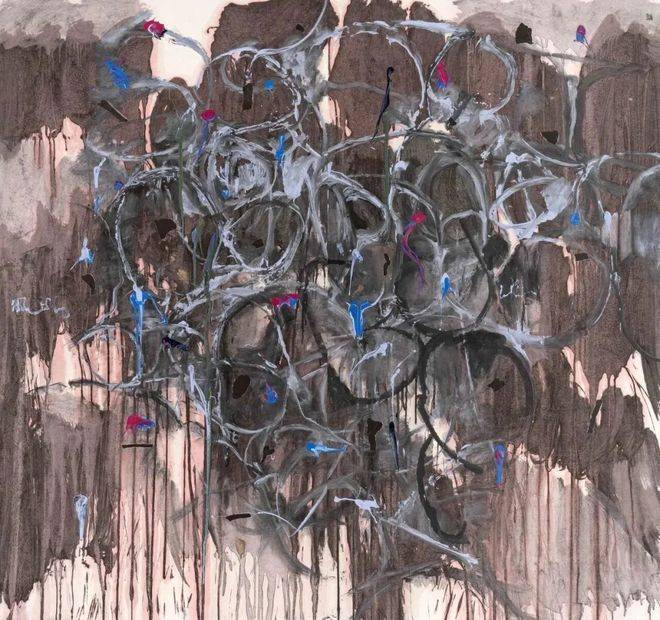 徐善循 草木灰線系列 2024年作 水墨 丙烯 89X96cm 他沒有炫技,盡管他技法純熟,而是通過作品內在透出一種沉靜的震撼,勾勒的線條仿佛生命寂滅后的遺存,卻在紙面上流轉著鮮活的氣息。部分線條滯緩沉凝,如禪者靜坐觀心,連時光都似隨之放緩;另有線條靈動飄逸,若流云渡谷,無拘無束間透著“應無所住”的自在。